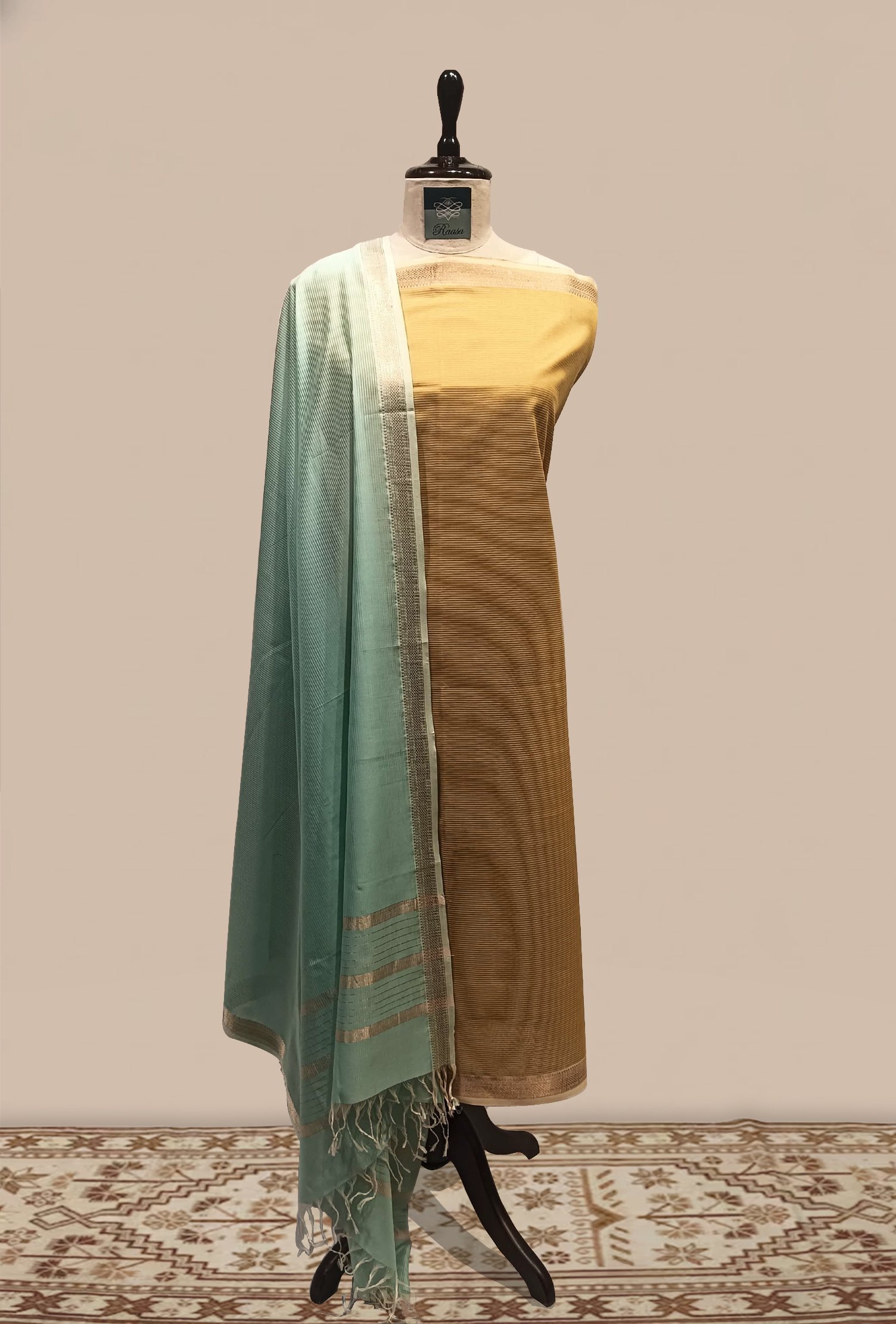 Maheshwari woven Suit 2 pcs – Mustard-Brown Kurta with Mint Green Dupatta
