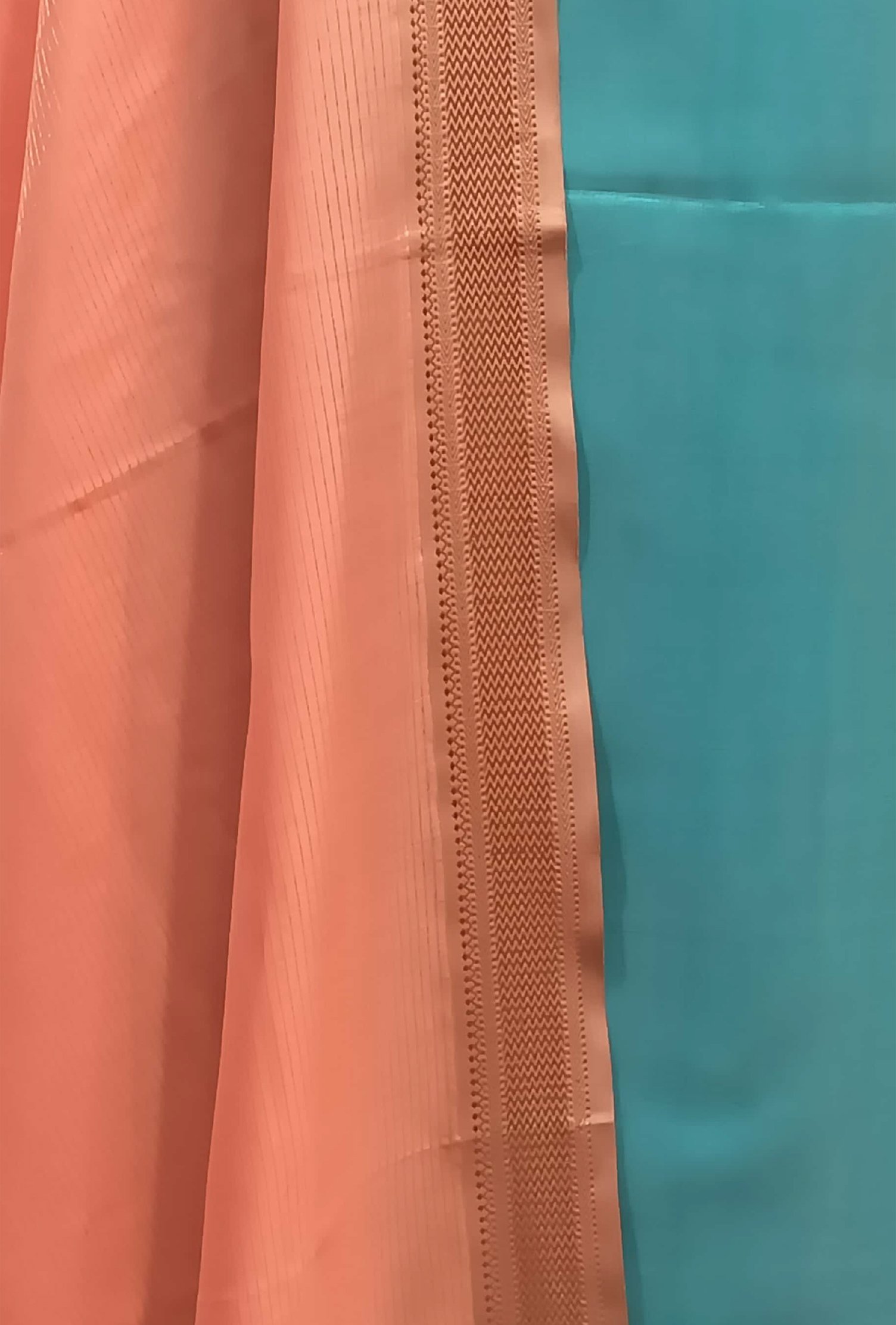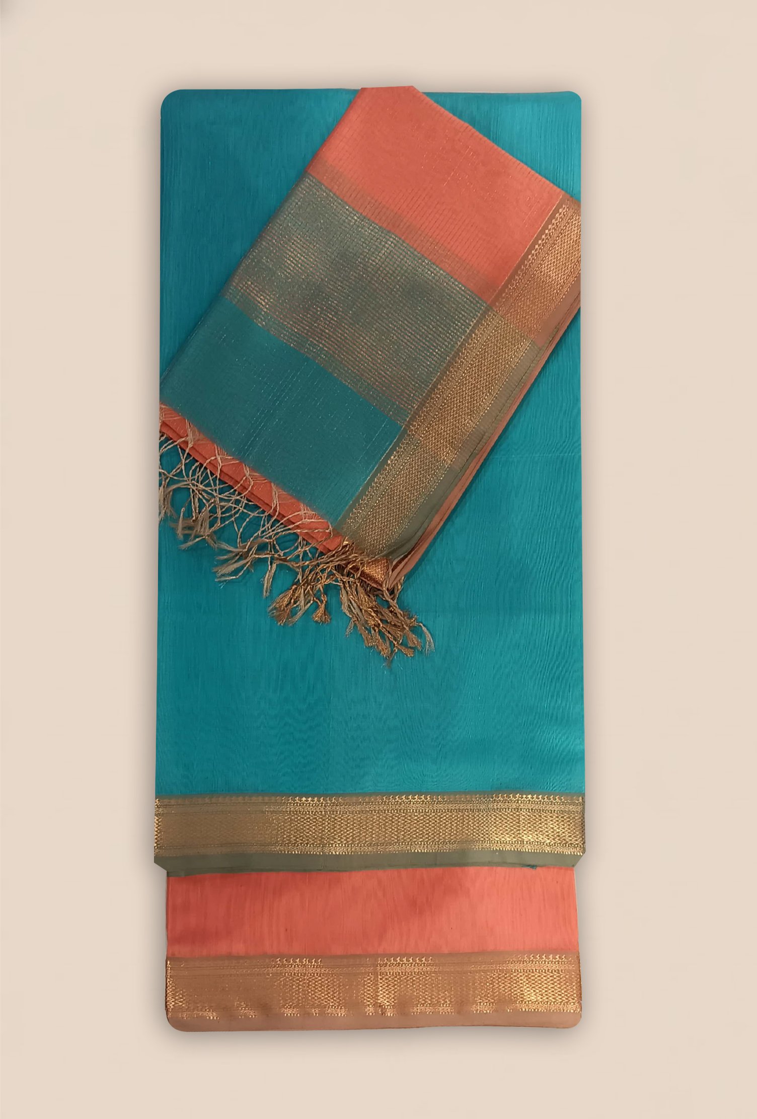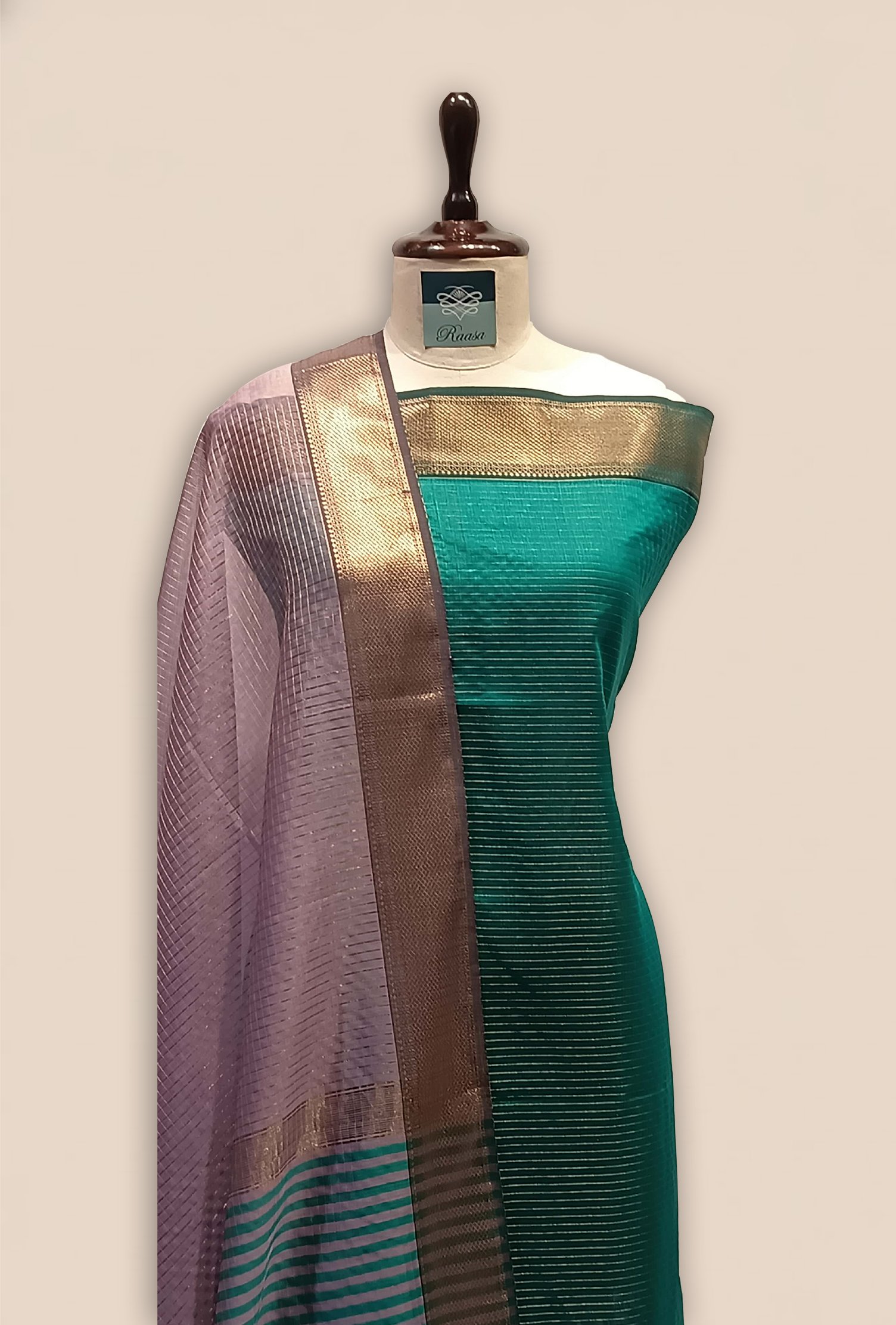 This elegant Maheshwari Woven Suit showcases a vibrant yet balanced fusion of cool and earthy tones, reflecting the timeless charm of traditional handwoven craftsmanship. The kurta fabric comes in a refreshing teal blue shade with a smooth woven texture and a subtle natural sheen, giving it a graceful and sophisticated ethnic appeal