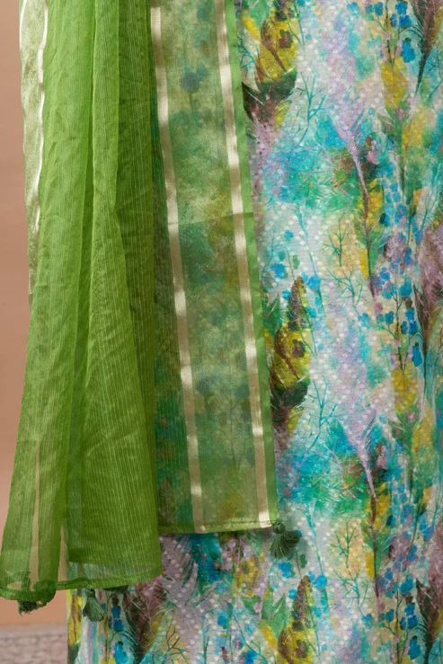 Kumud Printed Chanderi Suit with woven chanderi duppatta & plain bottom – Green