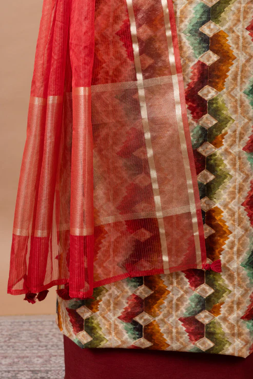 Rangrez Printed Chanderi Suit with woven chanderi duppatta & plain bottom – Maroon